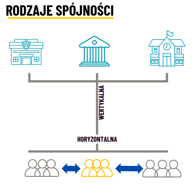 W psychologii mówi się, że składnikami spójności społecznej są “zaufanie, poczucie przynależności i chęć do uczestniczenia w działaniach na rzecz wspólnoty” i wyróżnia dwa jej rodzaje. O ile wspólnota sąsiedzka czy grupa etniczna to tzw. poziomy (tzw. horyzontalny) rodzaj spójności społecznej, o tyle spójność pionowa (tzw. wertykalna) wyraża się poprzez zaufanie do działań instytucji państwowych. Jeśli obywatele ufają, że ich podatki są dobrze zarządzane (np. finansuje się utrzymanie dróg lub opłacenie publicznej szkoły) i angażują się w życie publiczne (np. chodząc na wybory), to wskaźnik spójności pionowej jest wysoki.