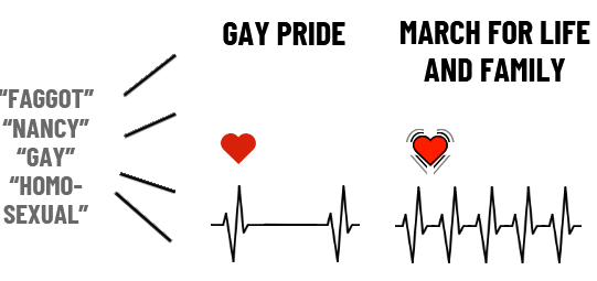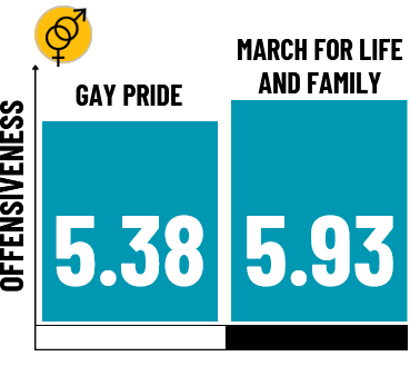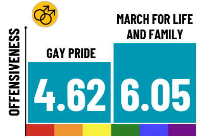 The mean (M, ang. mean) offensiveness of these words was lower (M = 4,62) when they were uttered during the Gay Pride than when they appeared at the March for Life and Family (M = 6,05).