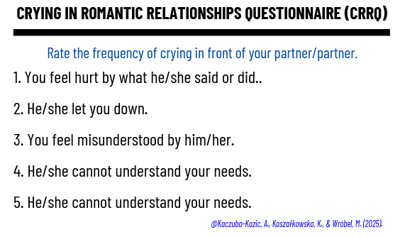 Before this could happen, however, it was first necessary to create a tool to study the types of emotional crying in romantic relationships. The Crying in Romantic Relationships Questionnaire (CRRQ), created by Kaczuba-Kozic, M.A., is an inventory of 25 questions in which subjects refer to situations described in statements (called items), rating on a scale the frequency of crying (in them) with their partner/partner. Sample items can be found in the graphic on the right.