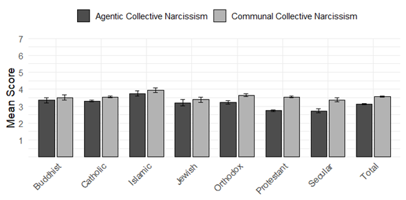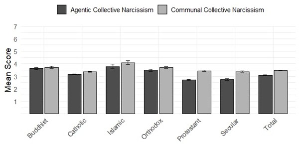 WYNIKI | Agnostycy i ateiści z krajów świeckich deklarowali niższy poziom narcyzmu kolektywnego (zwłaszcza sprawczego) w porównaniu ze osobami niewierzącymi z krajów religijnych. Ponadto u obu grup wyższe wyniki uzyskano w zakresie wspólnotowego niż sprawczego narcyzmu kolektywnego. Bycie agnostykiem lub ateistą przejawiało się zarówno w formie narcyzmu kolektywnego sprawczego, jak i wspólnotowego, na co wskazywało odtworzenie się modeli pomiarowych obu skal w każdej analizowanej grupie wyznaniowej.